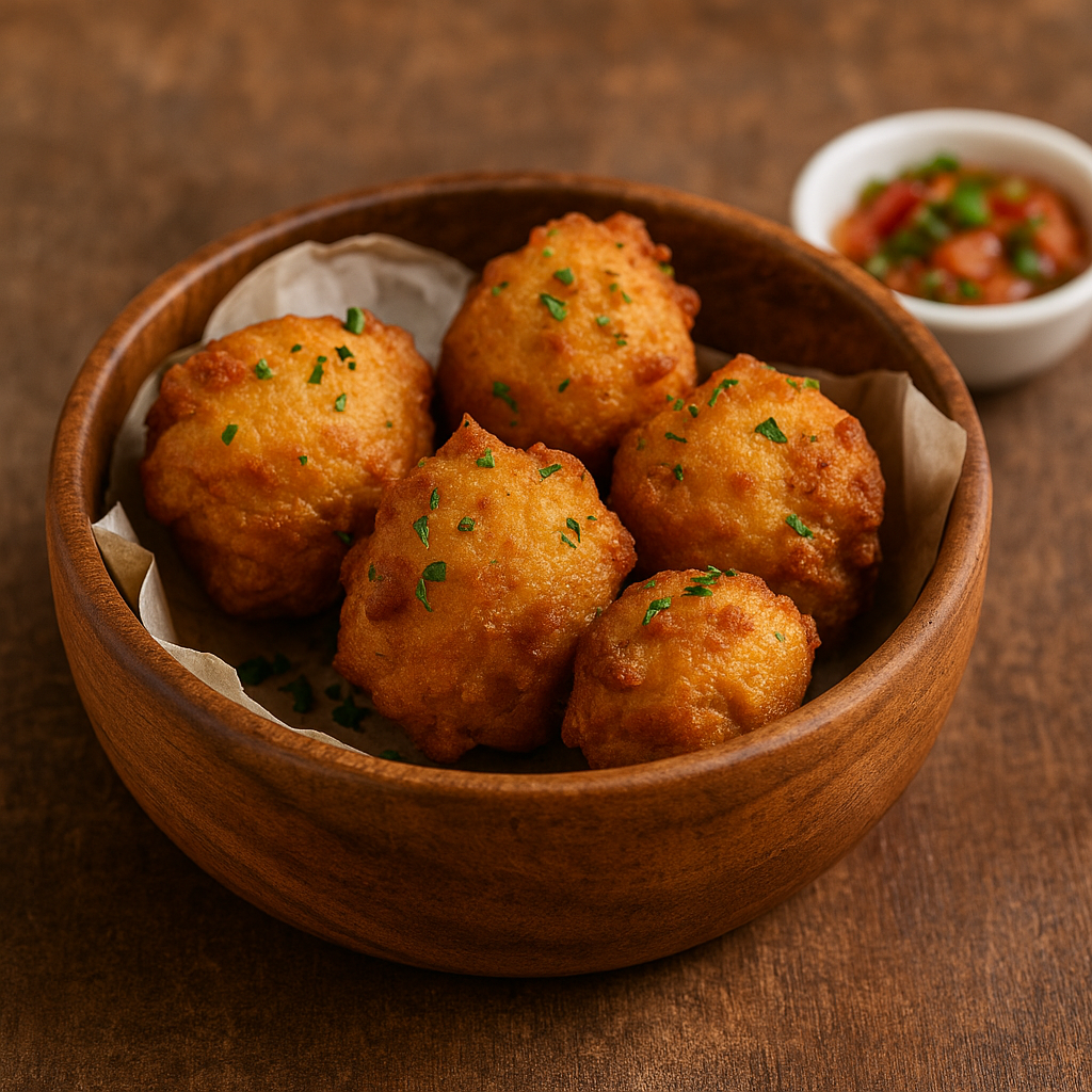 6 accras maison (thon, piment végétal, oignon nouveau, ail, persil, farine, œuf, lait, épices)